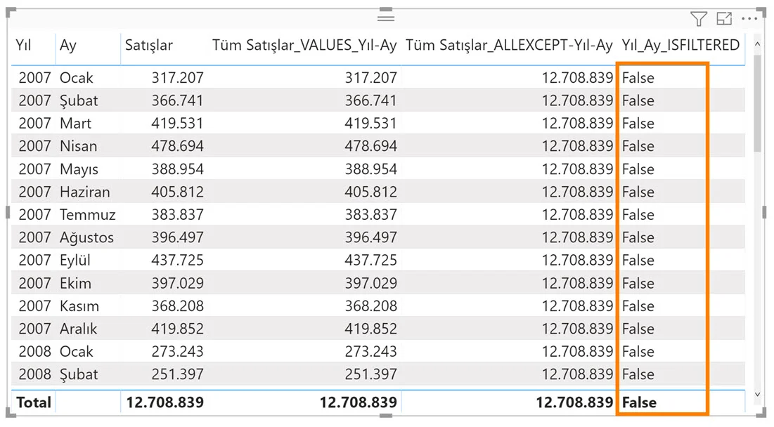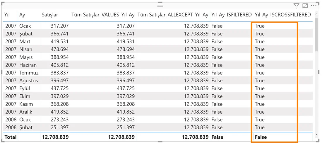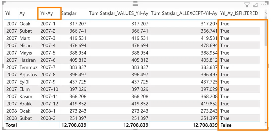 Her bir satırda Yıl-Ay sütunu üzerinde doğrudan bir filtre varken (ISFILTERED True dönüyor) Toplam (Total) satırında doğrudan bir filtre yok, ISFILTERED False dönüyor!