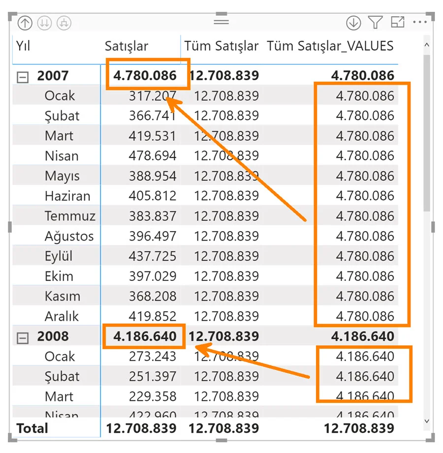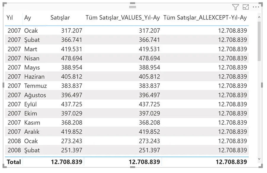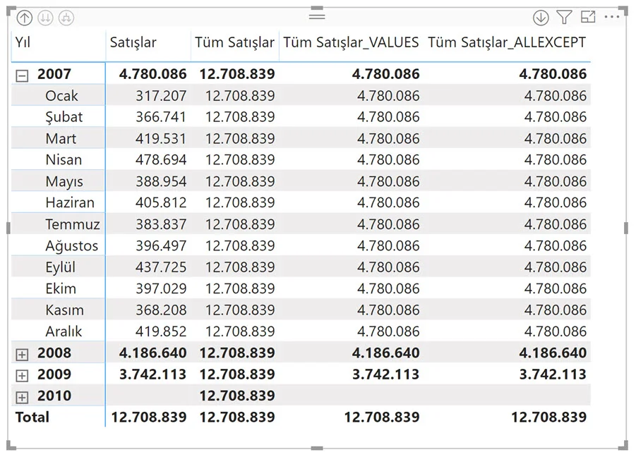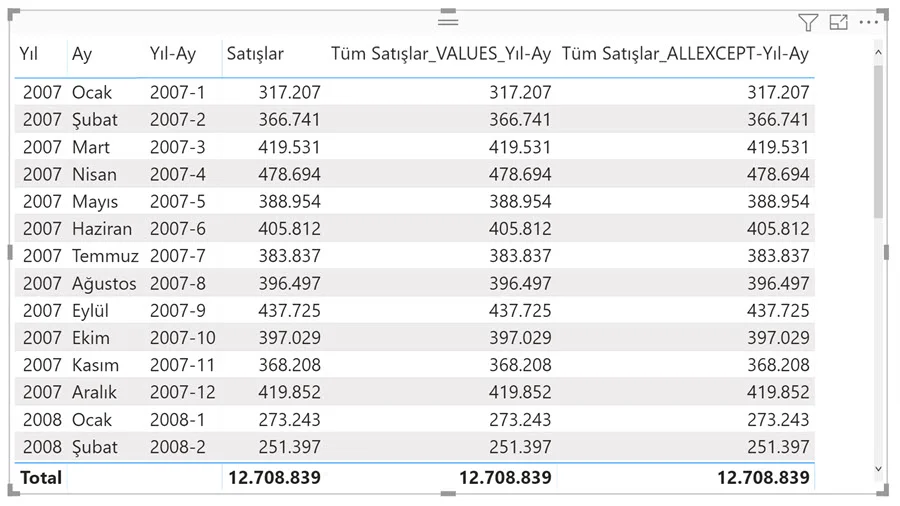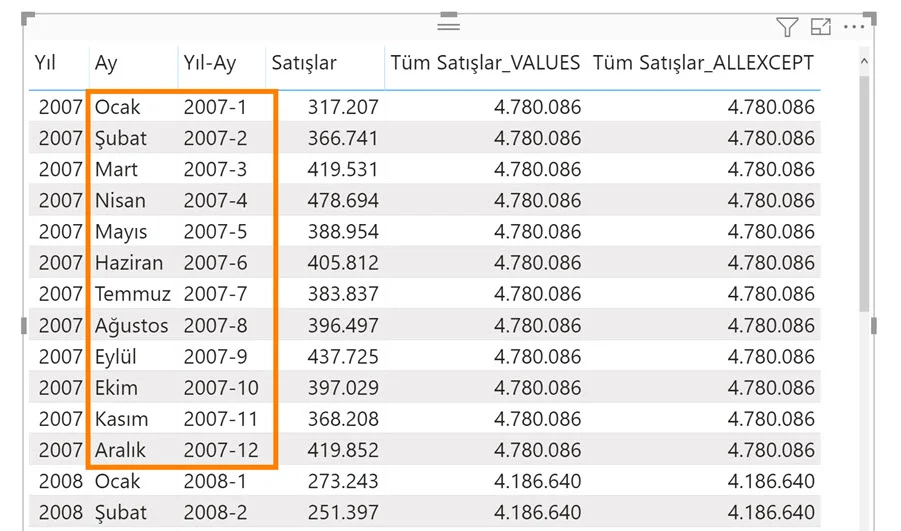 ALLEXCEPT( ‘Tarih’ ; ‘Tarih'[Yıl-Ay] ), eğer Yıl-Ay sütunu üzerinde doğrudan direkt bir filtre varsa bunu kaldırıyor! Matriste Yıl-Ay varken her bir değişimde ilgili Yıl-Ay’daki satışları gösterirken, Yıl-Ay sütununu matristen kaldırdığımızda gösterdiği şey tüm satışlar! Çünkü artık Yıl-Ay sütunu üzerinden doğrudan direkt bir filtre yok!