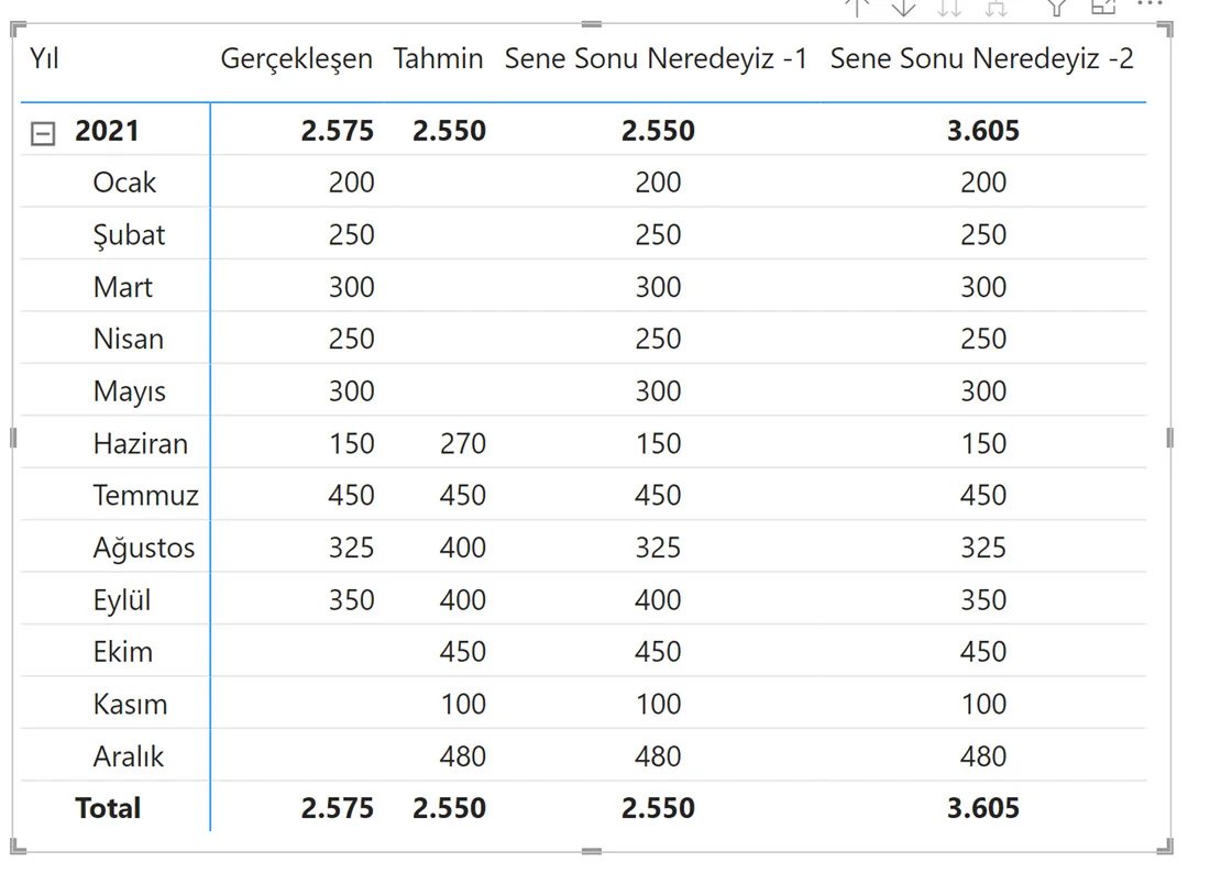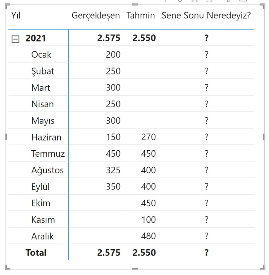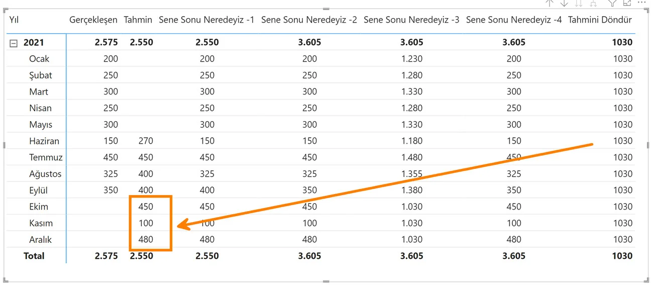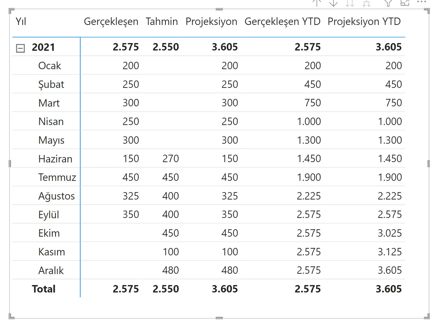 Bu tamamen başka bir kalıp oldu! _Tahmin değişkeni, filter context’i -ay satırlarında- tamamen değiştirip, sadece _SonGerceklesenTarih ‘ten sonraki tüm tahminleri topluyor, yani Ekim-Kasım-Aralık tahmin toplamını döndürüyor!