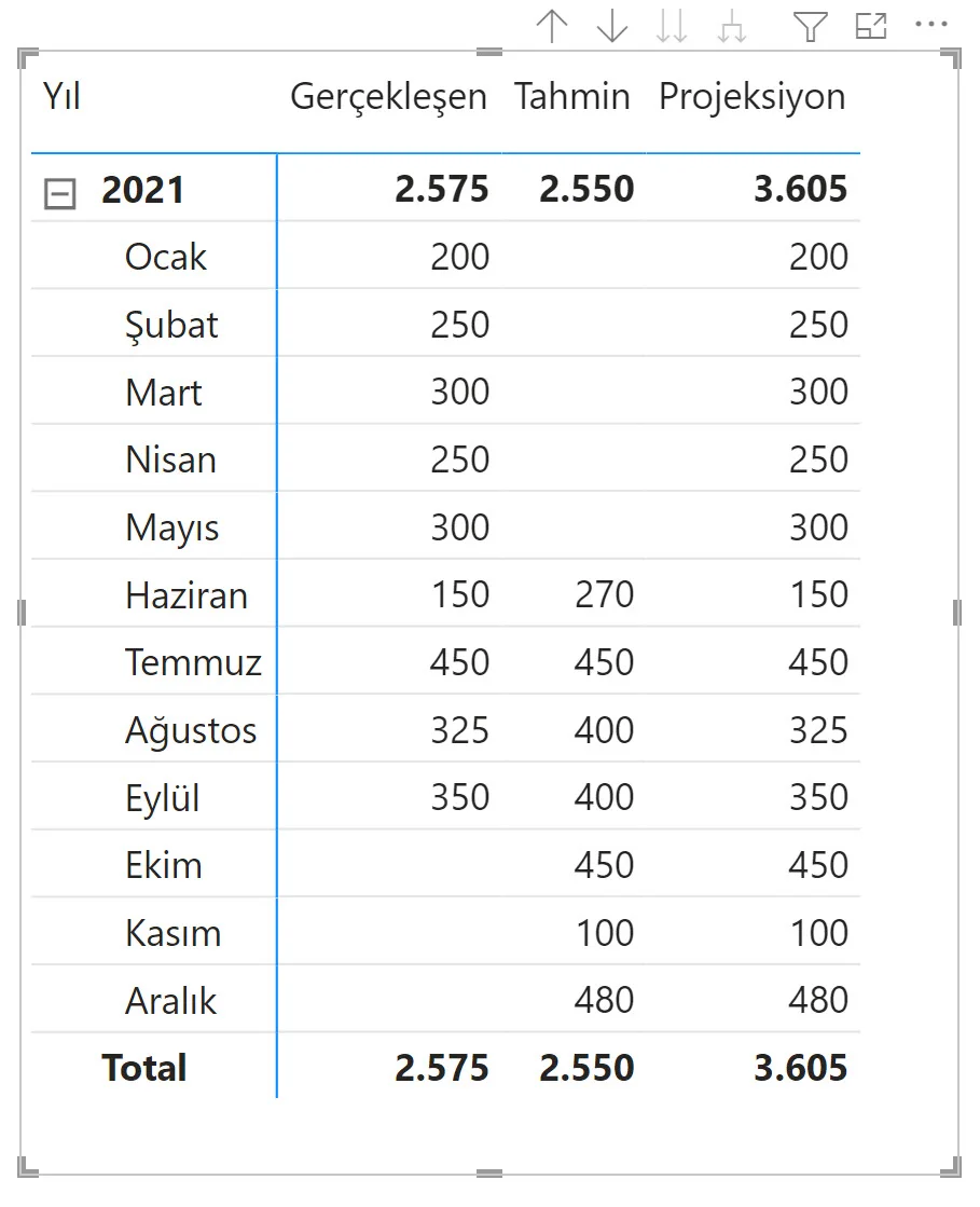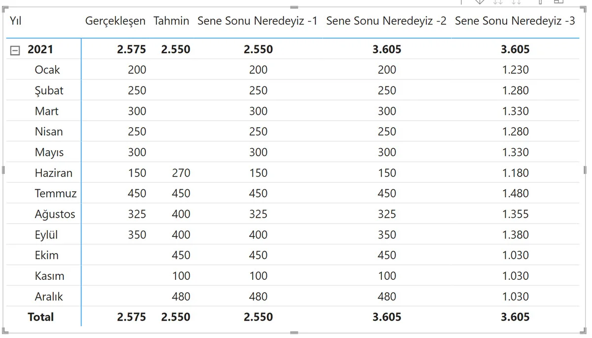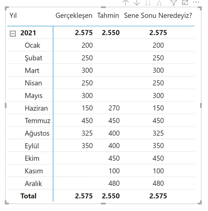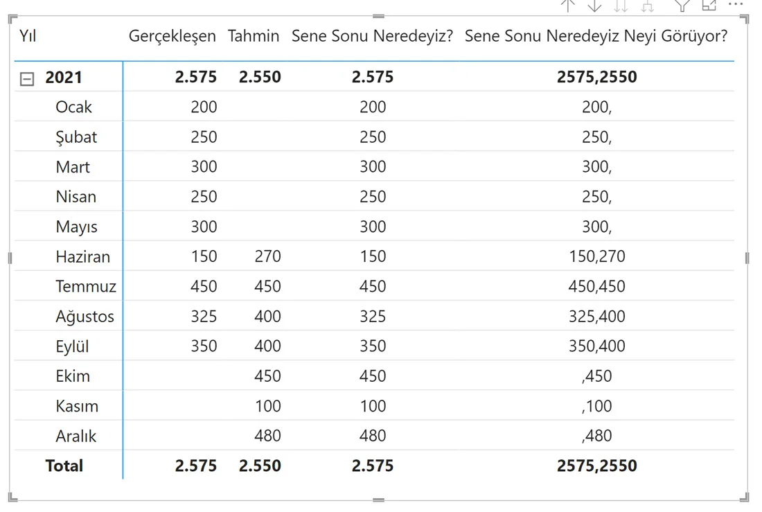Bu tamamen başka bir kalıp oldu! _Tahmin değişkeni, filter context’i -ay satırlarında- tamamen değiştirip, sadece _SonGerceklesenTarih ‘ten sonraki tüm tahminleri topluyor, yani Ekim-Kasım-Aralık tahmin toplamını döndürüyor!