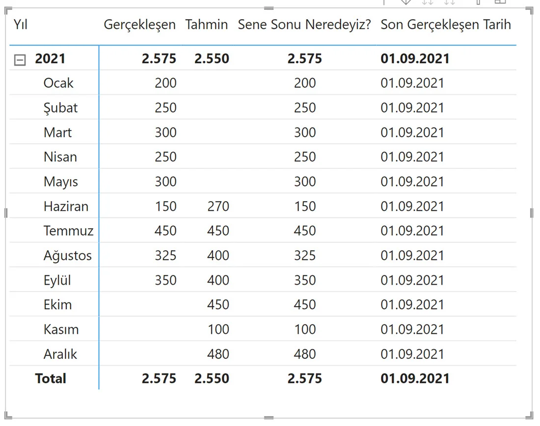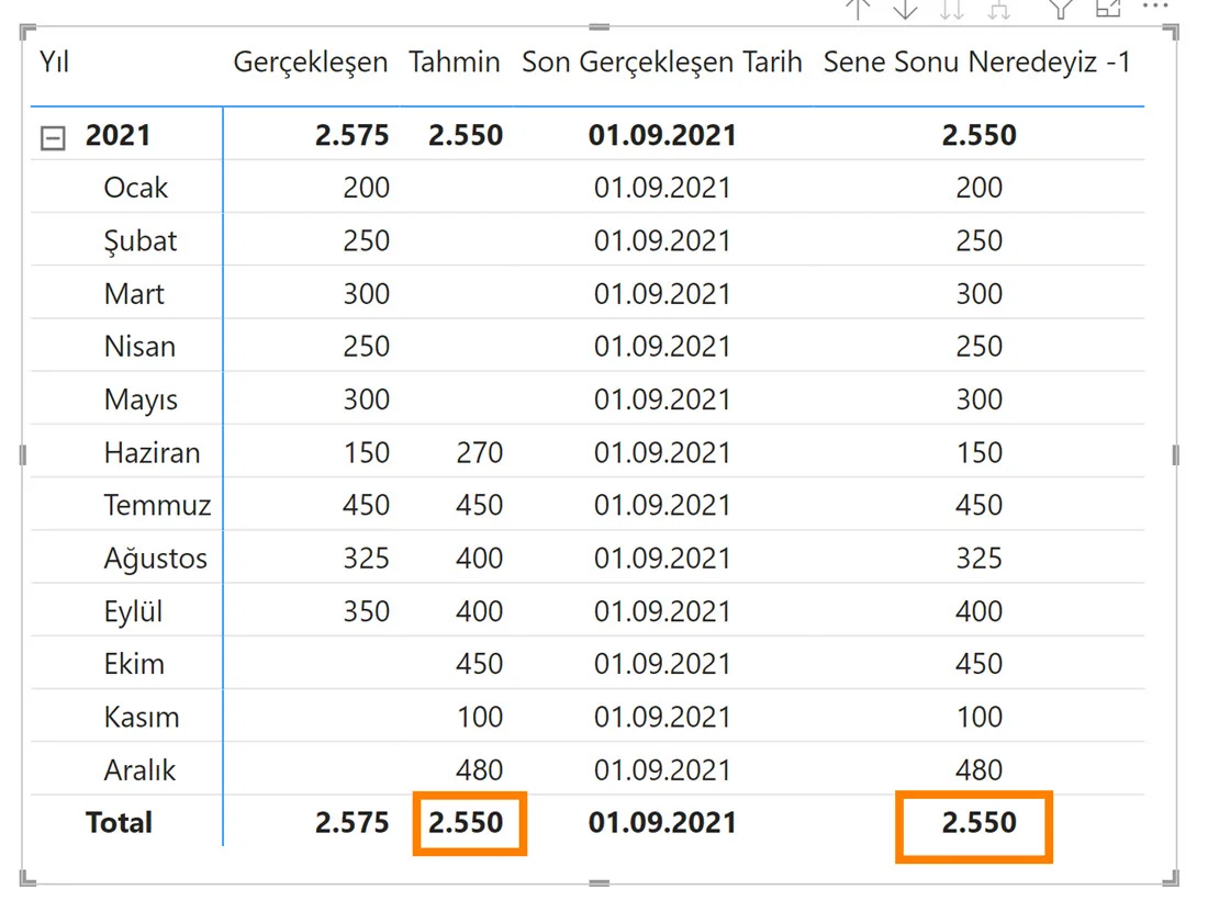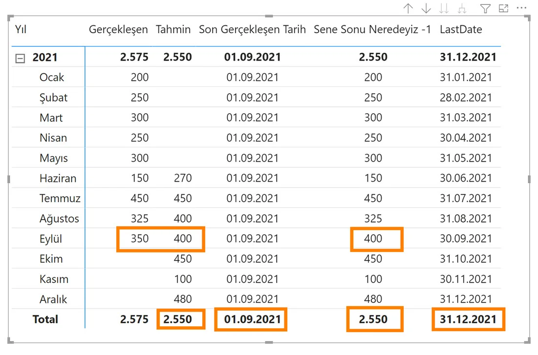 Ay bazında doğru çalışan metrik, yıl bazında gene istediğimiz sonucu vermiyor! İlk yaptığımız denemedeki aynı durumla karşı karşıyayız aslında, LASTDATE ( Tarih[Tarih] ), yıl satırı için 31.12.2021. Bu değer 01.09.2021’den büyük mü, evet büyük, o zaman [Tahmin] değerini döndür! Bu da 2.550!
