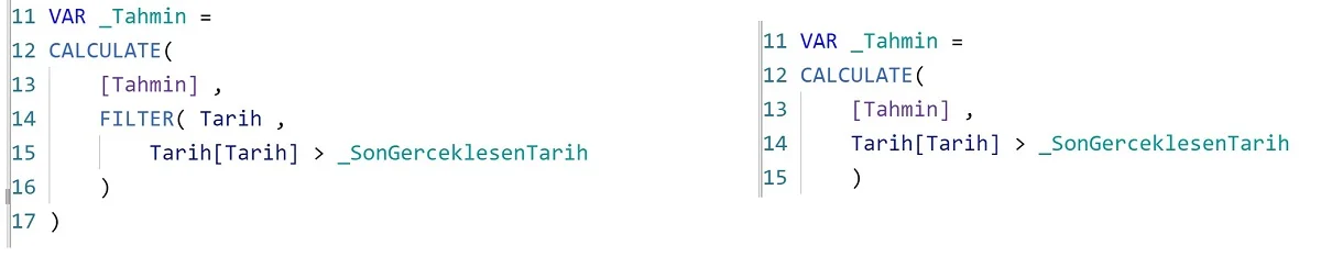 Mantığı biraz değiştirip, filter context’in yıl satırında ne gördüğünü de düşünerek formülü yeniden yazalım: Filter context’te gördüğün Tarih tablosunu filtrele, sadece _SonGerceklesenTarih ‘ten sonraki tarihler için tahmini döndür!