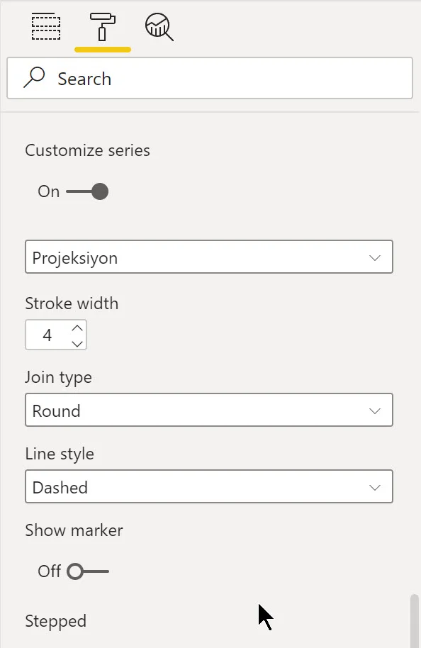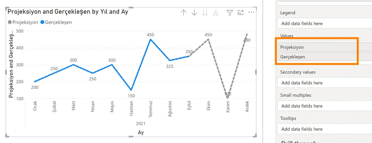 Buradaki temel espri, önce Projeksiyon, sonra Gerçekleşen metriğini yerleştirip, her iki serinin de görünümüyle/rengiyle uğraşmak!