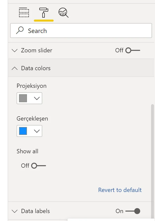 Serileri birbirinden farklılaştırmak için de format panosundaki “Data Colors” , “Data Labels” ve “Shapes” bölümleriyle oynayabiliriz.