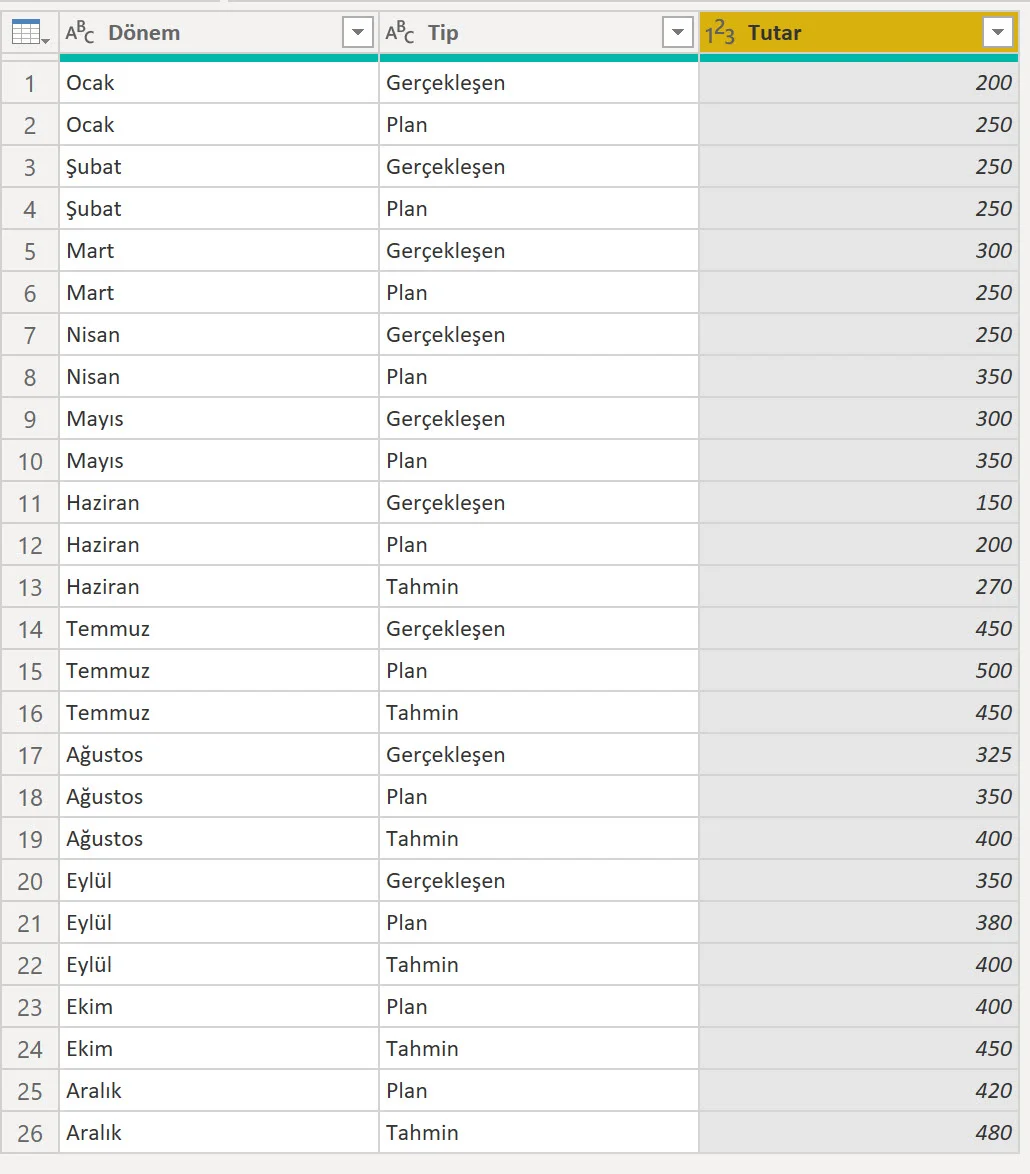Örnek data da böyle, 12 ay için sabit “Plan” rakamları var, “Tahmin” ise Haziran’dan itibaren var.